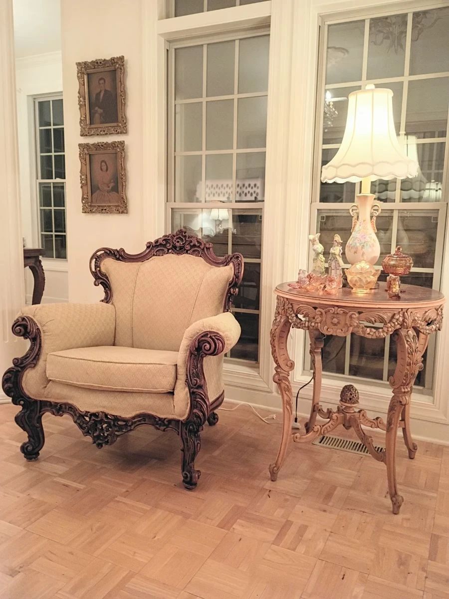 French style furniture and home decor, Louis XIV and Country French. 1920s Queen Anne bedroom suite. White Country French Bedroom suites. 1920s/1930s Kitchen cabinet with enamel pullout counter, built-in flour bin and sifter and ice box. 1940s/1950s dinette. Victorian era dining chairs. 1920s dining table with chairs. Queen Anne Victorian era sideboard. Many pieces of art, framed, unframed, frames, sconces, mirrors. Lamps from oil lamps through the 1950s. China, porcelain, glassware, ceramics. Dolls, from 1950s Fashion dolls to Barbie. Travel trunks from the 1880s to the early 1900s. Hand wrought two man saws and other rustic items. Tablecloths, curtains, crochet...