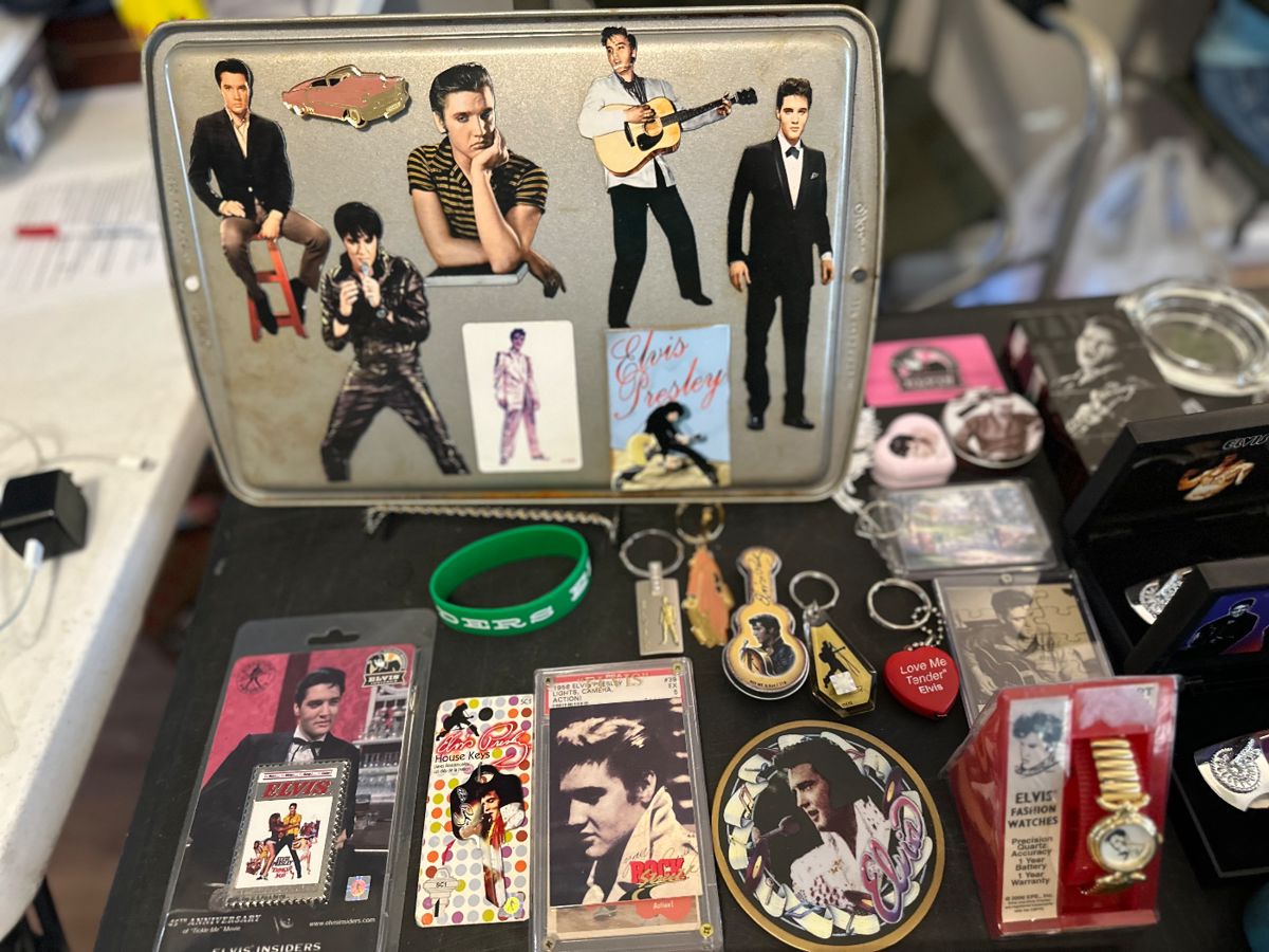 Elvis Presley figures, pins, dept 56, books, magazines, record player, ornaments, watches, trading cards and tons more, Barbie’s, glass cats and pictures, Christmas decorations, precious moments, glass kitchen table and 4 chairs, bakers rack, chickens and roosters, Tupperware, pots and pans, kitchen aid mixer, kitchen utensils, gadgets, christmas decorations, fall and Thanksgiving decor, Easter decor, bench, 4 oak chairs, 3 odd wood chairs, odd tables, 2 curios, beautiful oak table and 6 chairs and oak china cabinet, China and tons more