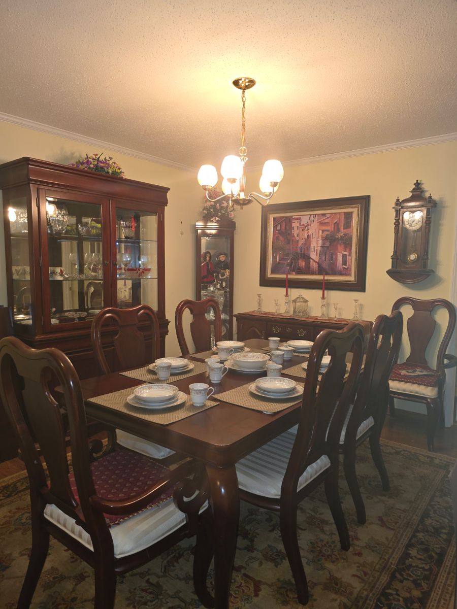 This sale offers a very nice China Cabinet & matching table with 6 chairs Universal Furniture sideboard Small lighted curio Waterford stemware Millennium collection Gorham Crystal Biscuit barrel Waterford Tara Candlesticks Area rugs Regulator wall clock Premiere Fine China - Japan Porcelan dolls Happy Holidays Nikko Christmas China Gray modern recliner Cast iron wiener dog door stop Lane Chippendale Coffee table and side table Brass table lamps Hand blown glass Gold toned overstuffed chair and a half Small roll top desk Patio set Mikasa Dinnerware Oak Hutch Oak Lions paw pedestal table Misc kitchen items, small appliances, pots and pans...