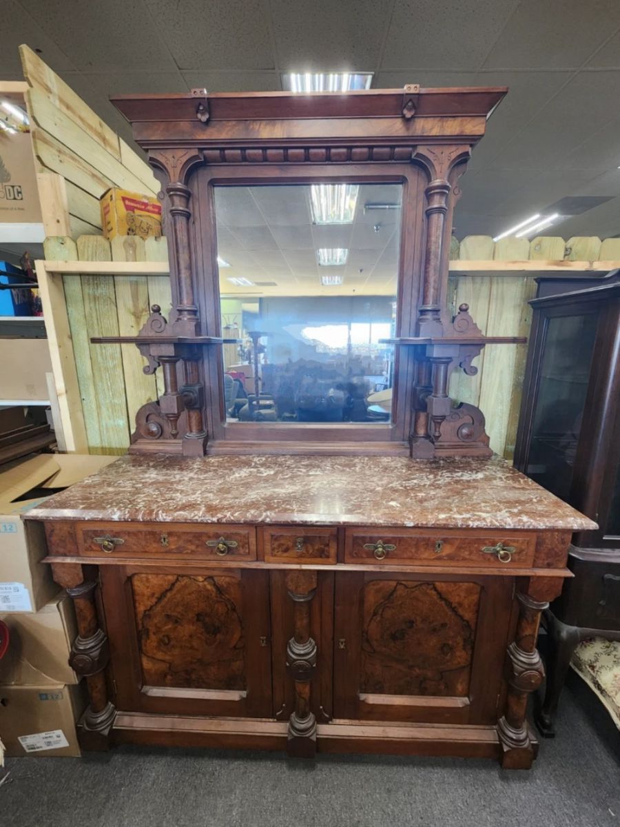 Furniture:  Large marble top sideboard, Corner china cabinet, primitive style cabinet, Dining table w/chairs, recliners, sofa, occasional and accent tables, patio furniture
