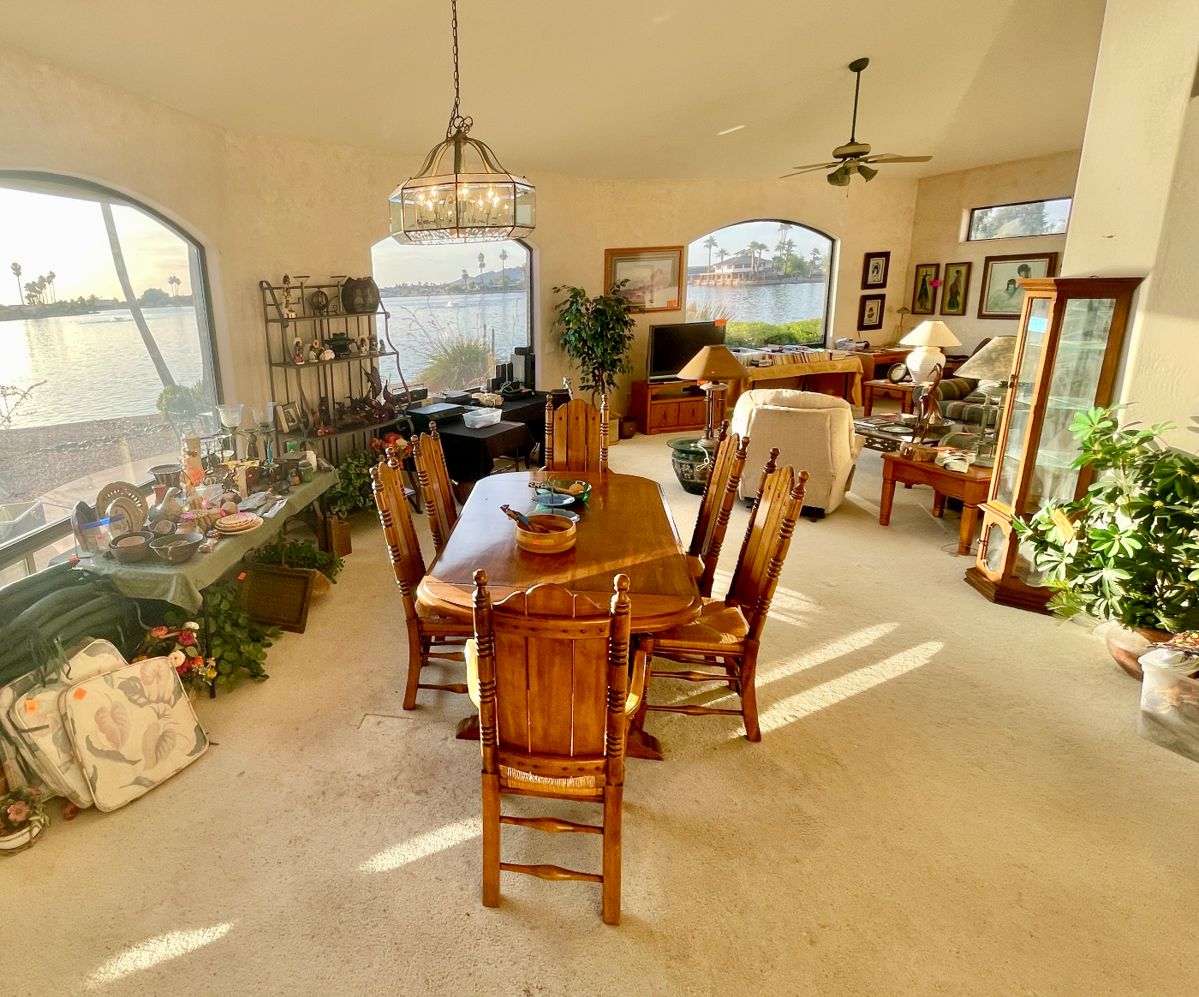 This is a beautiful home on the lake in AZ City with Southwest decor and quality furniture. Check out the vintage Franciscan Atomic Starburst dishes! We have two queen beds, bedroom sets, China cabinets, a packed kitchen, patio furniture, jewelry, quality men’s and women’s clothing, DeGrazia artwork, Pyrex and more.