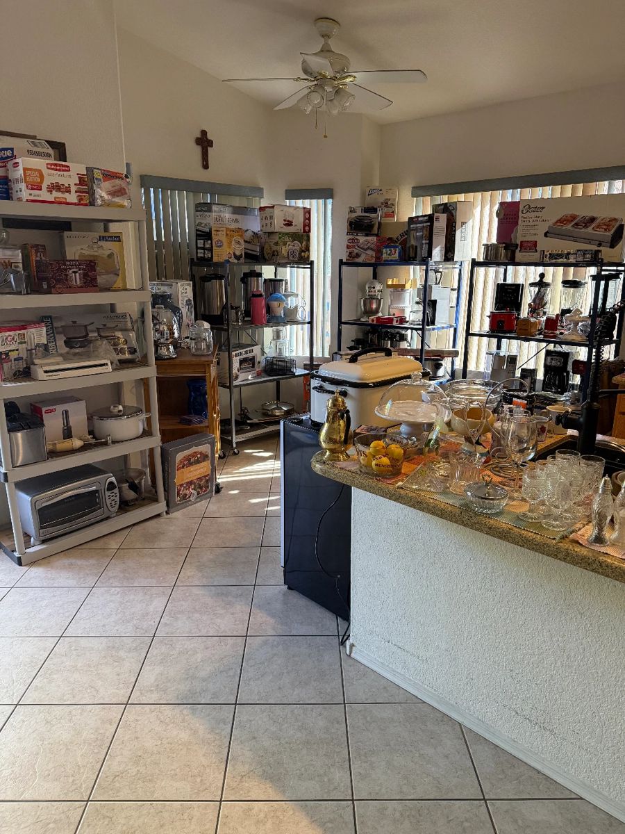 This amazing Northwest side home is filled with knick-knacks galore to kick off your holiday shopping! Please take a moment to view the photos on our website of all of the things that we have to offer, as it is impossible to list everything! Some of the items include but are not limited to… A nice selection of kitchenware including small kitchen appliances, glasses, vintage kitchenware, pots and pans, utensils, baking dishes, mugs, toasters, wine cooler, kitchen island, candles, pottery, stereo, curved TV, oak entertainment center, Waterford clock, dvds, cds, records, books, 45s, cedar chest, pine dresser and mirror, nightstands,...