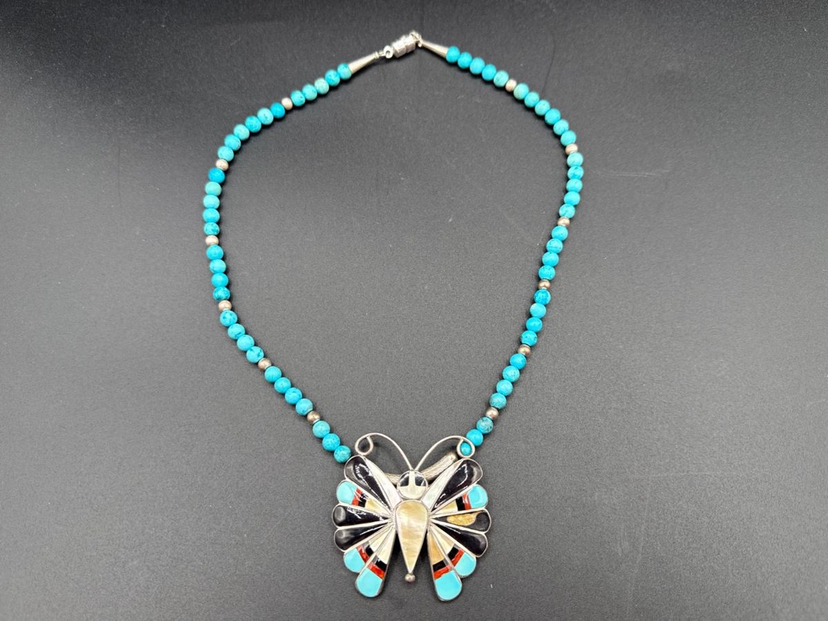 This Auction includes: More lots being added! 1 - Vintage Sterling Silver Native American Zuni Butterfly Pendant & Necklace 2 - Sterling Silver Earrings with Pink Stone 3 - Sterling Silver Feather Earrings 4 - Sterling Silver Necklace with Red Stone 5 - Sterling Silver & Coral 6 - Sterling Silver Bracelet with Stones 7 - Sterling Silver B. Burger Wolf Bracelet 8 - Sterling Silver Wolf Bracelet 9 - Beaded Necklace 10 - Sterling Clasp with T 11 - Beaded Necklace 12 - Turquoise Beaded Necklace 13 - Sterling Silver Belt Buckle 14 - Effie C. Zuni Sterling Silver...
