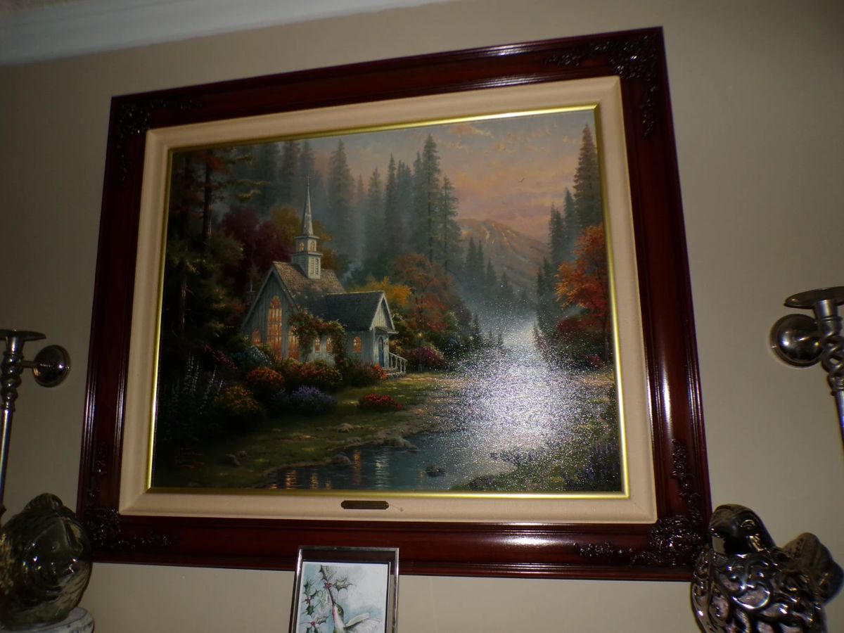 This Estate has some great items! We hope that you can come and join us for the fun. Watch for our Pink and Black signs the days of the Sale. Some of the Contents: *Thomas Kincade "Clock Tower Cottage" *Thomas Kincade "Still Water Bridge" *Thomas Kincade "The Mountain Chapel" *Thomas Kincade "Chapels of Nature" *Thomas Kincade "Gardens Beyond Spring Gate" *Thomas Kincade "The Forest Chapel" *Thomas Kincade "Lamp Light Manor" *Landscapes and Abstracts by local Artist! *Roseville Pottery *Occasional Chairs *Chaise Lounge *Linen *Throw Pillows *Sewing Material *Sewing Notions *Yarn *Candles *Candle Holders *China Cabinet *Xmas Dishes *Crystal *Stemware *Lamps...