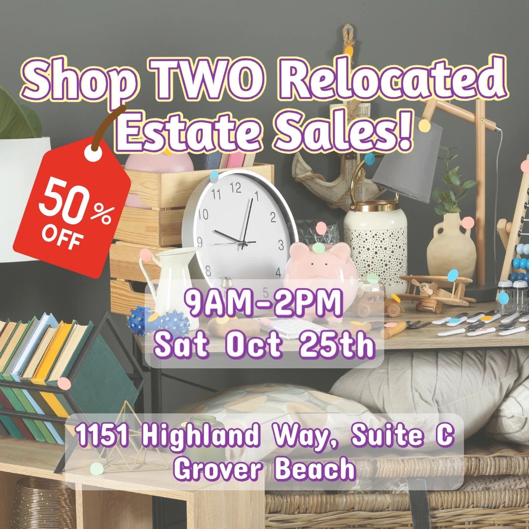 This sale combines the contents of two Central Coast homes, bringing together an eclectic mix of furniture, décor, books, kitchenware, and more! Everything is half off starting Saturday at 9AM! 📆 Saturday, Oct 25th 🕘 9 AM – 2 PM 📍 1151 Highland Way, Suite C, Grover Beach Highlights include: Furniture pieces, from vintage to contemporary styles, Home décor, wall art, and decorative lamps, Kitchenware, glassware, and small appliances, Shelves of books, games, and collectibles, Clothing, shoes, and accessories, Wicker and outdoor seating, Electronics, including a keyboard, New items are being added daily — stop by and see what’s new!...