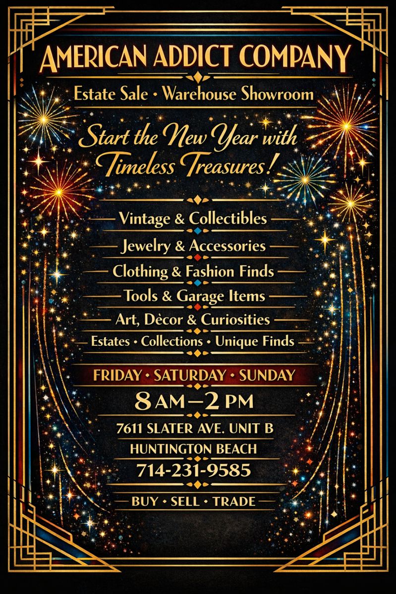 Ring in the New Year by investing in pieces that last. Discover vintage, estate finds, and one-of-a-kind treasures to kick off a great year ahead. ✨ What you’ll find: • Vintage & collectibles • Jewelry & accessories • Clothing & fashion • Tools & garage finds • Art, décor & curiosities • Estates, collections & unique surprises 🗓 Friday · Saturday · Sunday ⏰ 8 AM – 2 PM 📍 7611 Slater Ave. Unit B, Huntington Beach 📞 714-231-9585 Buy. Sell. Trade. Start your year inspired — vintage style never goes out of style. ✨