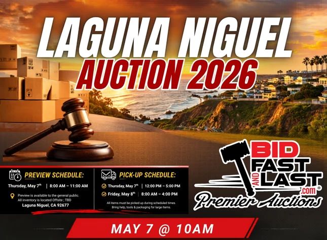 Furniture, Sculptures, Vases, Coins, Jewelry & More – Laguna Niguel Auction 2026 – No Reserve! Join us for the Laguna Niguel Auction 2026 featuring a great mix of estate items including quality furniture, decorative vases, sculptures, coins and bullion, jewelry, and more. Everything sells to the highest bidder with no reserve. Preview Schedule: Thursday, May 7th 8:00 AM – 11:00 AM Preview is available to the general public. All inventory is located off-site; address will be released prior to preview in Laguna Niguel, CA 92677. Pick-Up Schedule: Thursday, May 7th 12:00 PM – 5:00 PM Friday, May 8th 8:00 AM...
