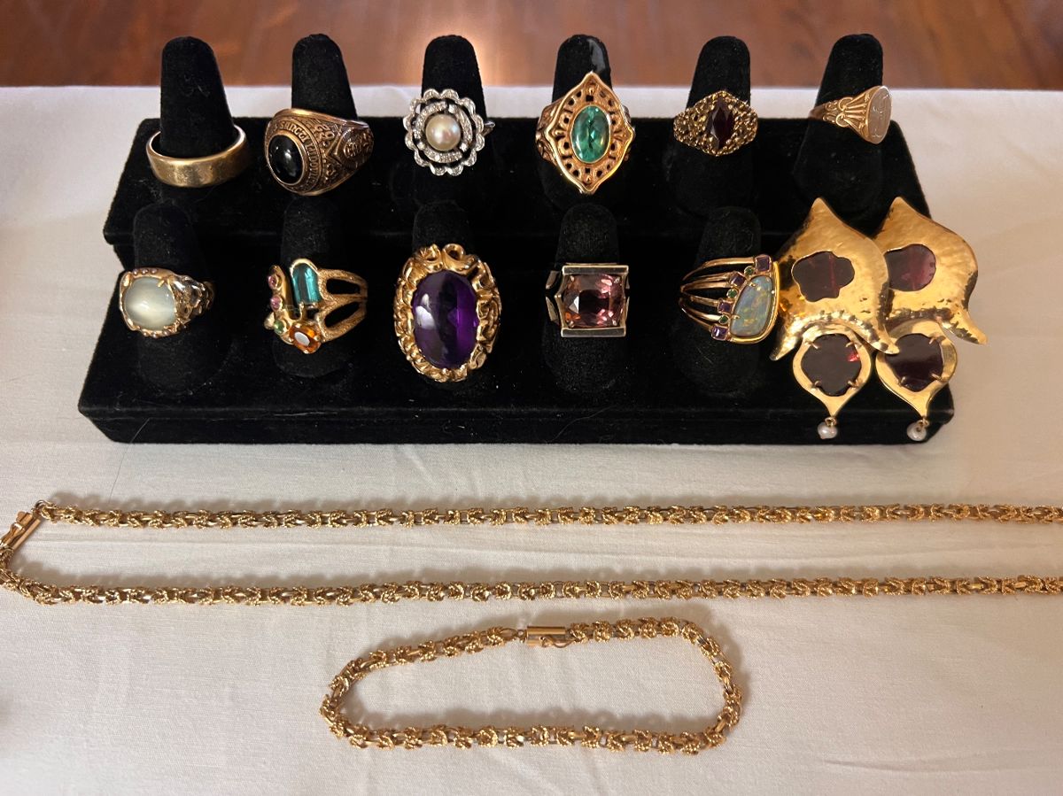 Lovely sale with gold chunky rings, gold jewelry, Sterling jewelry, costume jewelry, coins, Sterling items, artwork, large collection of books-many aeronautical & 1st editions, stained glass, collectibles, owls, glass,, perfume bottles, some vintage clothing, cedar chest, clocks, mid century credenza, red leather sofa, side tables, lamps, bedroom furniture, linens, bookcases, upright freezers, kitchenware and more
