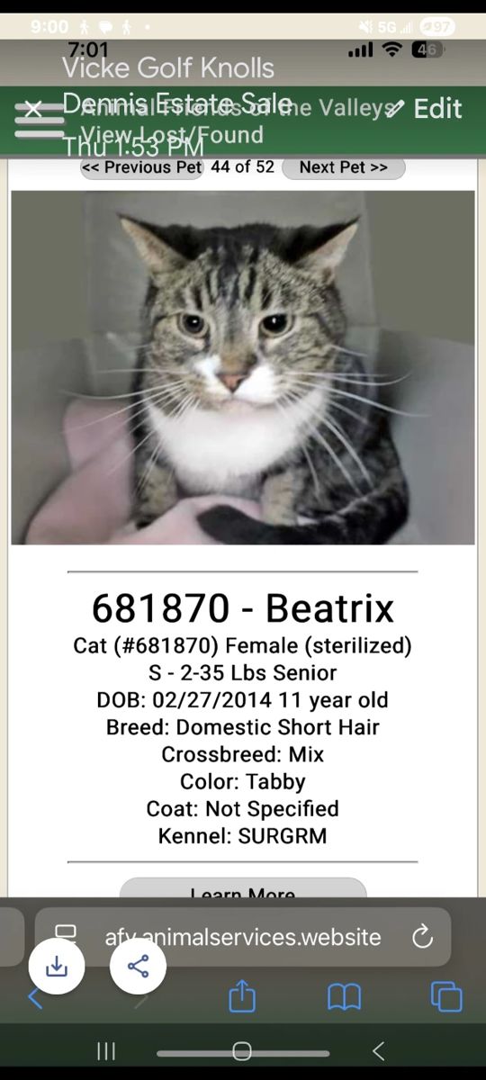Looking to re-home an elderly sweet cat displaced by no fault of her own. Please text or call 951-440-9270 for information and vetting process.