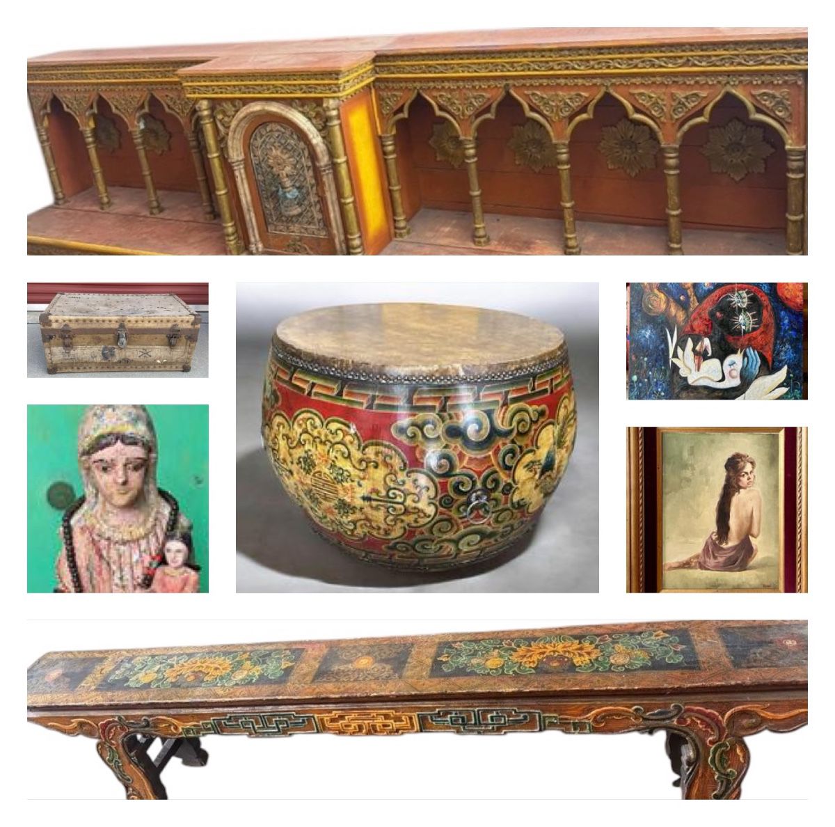 This Sale Features an Eclectic Selection of Imported Antique and Vintage Furniture, Antique Tibetan Hand-Painted Cabinets, Rare Indian Architectural Altar with Hidden Steel Safe, Antique Saint Statuary, Large Tibetan Ceremonial Drum, Vintage Asian and Global Decor, Mid-Century and Rustic Furniture, Fine Art, Vintage Oil Paintings, Carved Wood Furniture, Rattan and Wicker Seating, and Home Decor.