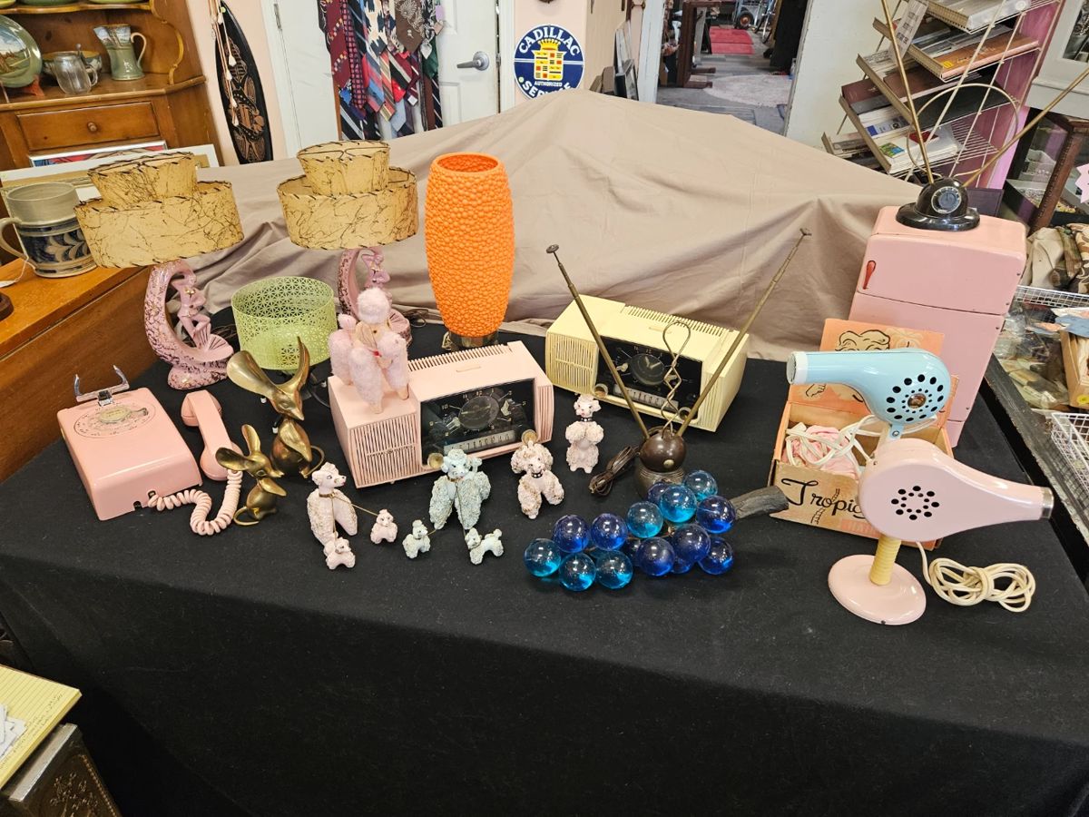 Midcentury Atomic Extravaganza & Roseville Pottery @ Schiff's Estate Sale Building 1309 Del Paso Blvd Sacramento, 95815 916-923-1443 Open Daily 11:00 am - 3:00 pm PHOTOS Highlights: Ericofon Cobra Rotary Phones, Pink Sunbeam MixMaster Stand Mixer, Wolverine Tin Toy Refrigerator, Style-Queen & Tropic-Aire Hair Dryers, Atomic Orange Bubble Blow Mold Tripod Lamp, Vintage Ceramic Figures, Planters and Candleholders by California Originals & Shawnee Kenwood, 1950s GE C-416 Clock Radios, MCM TV Lamps by Maddux & Lane Ceramics, Frankart Nymph & Frog Bookends, Osterizer Galaxie Ten Blender, Pyrex Pink Daisy & Aqua Snowflake Covered Casseroles, Hazel Atlas Swanky Swigs Glasses, Paint-by-Number...