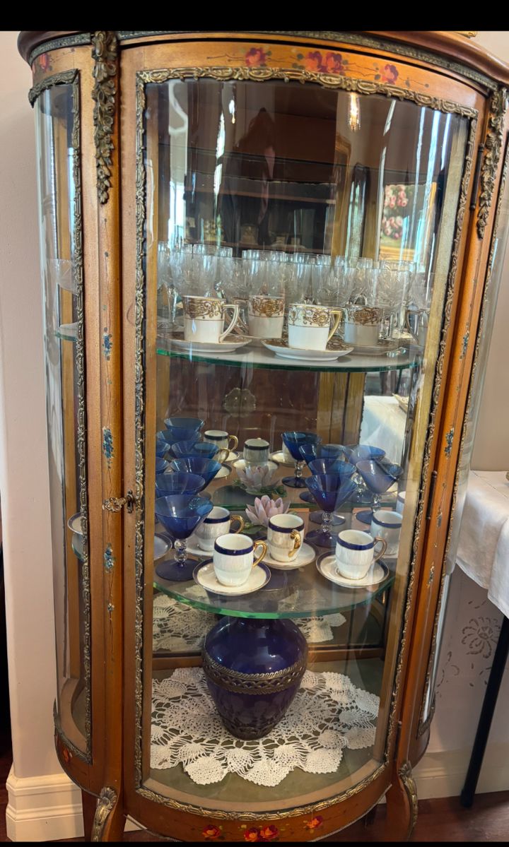 Stuff everywhere! Cloisonné, mirrors, furniture, dinning table, buffet, glass display cabinets, women’s clothes, brand new Cal-King mattress, paintings, linens, full kitchen, China, lots of beautiful vintage glass, lots in the garage, patio furniture, Kangen water system, Asian decor and full boxes to dig through everywhere!