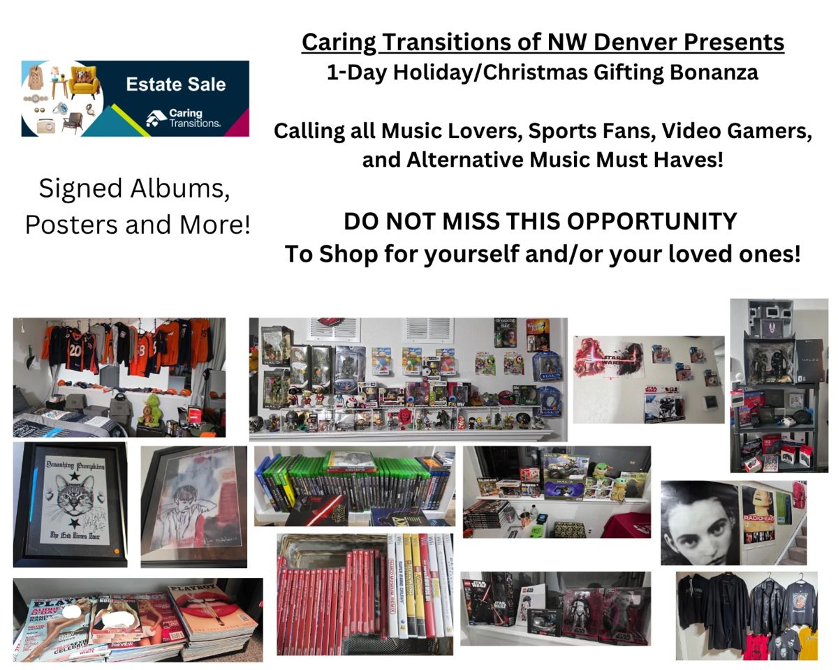 1-Day Holiday Gifting Bonanza! Calling all Music Lovers, Sports Fans, Video Gamers, and Alternative Music Must Haves! This is the holiday shopping event you can’t miss! Saturday 11/8 – 10am – 4pm ONLY at 6725 West 84th Way, Apt. 72 Arvada, CO 80003. This special sale features carefully preserved collector’s items, each priced according to its quality and rarity . Please note, this is not a bargain or typical estate sale — items are valued and priced as true collectibles. Gaming Galore: Xbox Series X Halo Edition, Xbox 360, PS4, Nintendo Switch 2, Nintendo Switch, Sega Genesis Mini, NES, SNES...