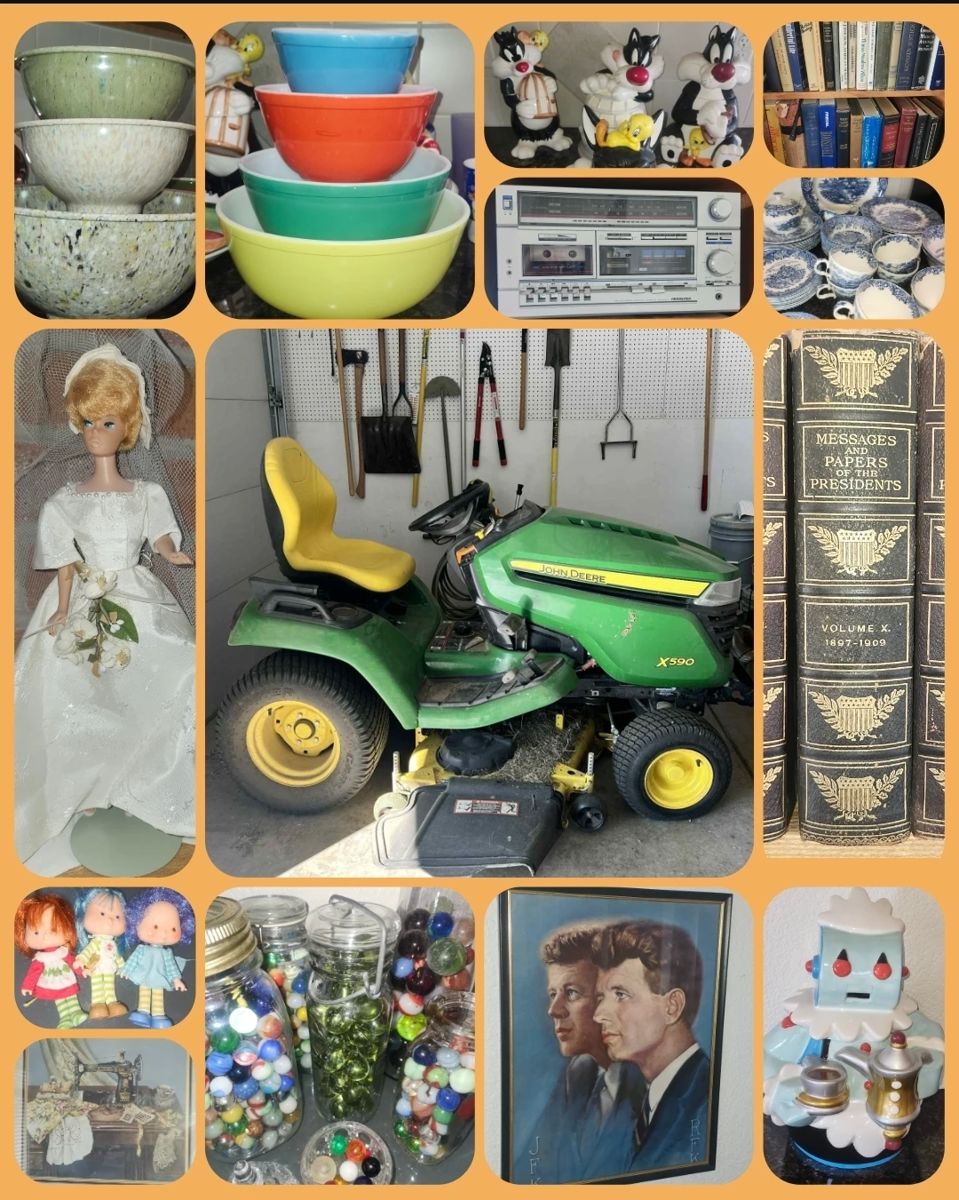 This is gonna be a fun one so many Collectible retro items! Cookie Jars, Presidential items, Stamp collection, Art Work, Furniture-Dressers, beds, couches & more, King Size Bed, Vintage Toys, Riding Lawn mower, Vintage Books 📚, Games, Tea Pots, Cook Books, Freezer, Wheel Barrow, Grill, Patio Table glass top, Hand Tools, Storage Totes, Knick knacks, Pyrex bowls, China Set, Stuffed animals collectibles, Barbies, Book shelfs, Legos, Toiletries, Clothing, Purses,Wallets Bags, Backpacks, Linens,Comforters,101 Dalmatian throw, Vintage Rocking chairs, And more! Will update more pictures next week!,
