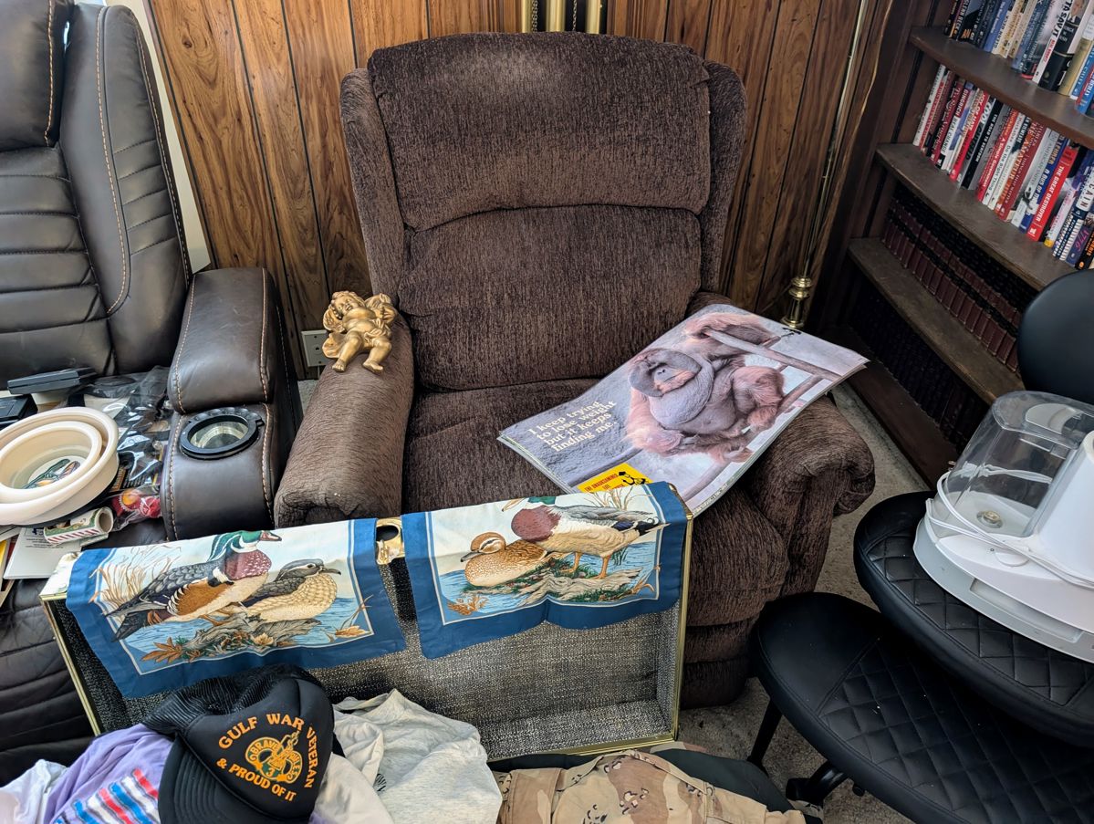 Almost every item is 'Make An Offer'. $10 to fill a box, bring your own box or container. 2007 Honda Civic, needs new shocks and battery, 140k miles, make an offer, Two beds with frames and mattresses, Gun Safe, Living Room Furniture: Couch, two recliner chairs, end tables, coffee table, Dining room table with leaf and chairs, Riding lawn mower, Tools, Fishing and hunting gear, Desert Storm military gear, Gas grill, several portable camping grills, Clothes, many which have never been worn, Books, Kitchen appliances and wares, Collectibles,