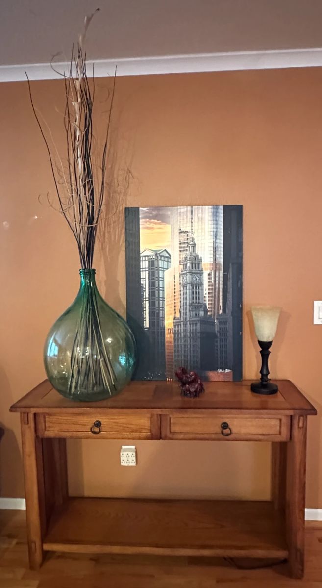 Shopping & Leaf Peeping in Louisville!! Wood and leather sofa, loveseat, and matching chair, Round copper coffee table, Wood sofa table with two drawers, Art and wall decor, Wood and glass storage cabinet, Area rugs, Large glass vase, Floor and table lamps, Cookbooks, Glass top round end table, Books, Art glass vases, Paper weights, Hackefors Sweden dinnerware set, Thanksgiving soup tureen by Williams Sonoma, Vintage fondue pot, Small kitchen appliances, Candles, Glassware, Stainless mixing bowls, Crown Ducal Gainsborough dinnerware set, Office chairs, Caracas Dinnerware set by Tabletops Gallery, Vintage patches, Costume jewelry, Palm tree corner shelf, Brown cloth with circle...