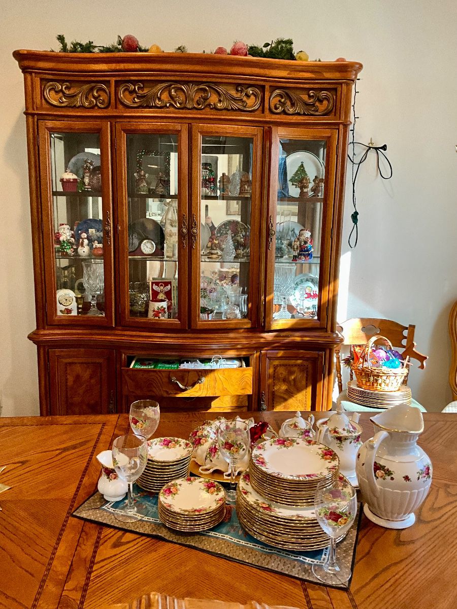 China, china cabinet, dining table and chairs, silverware, sofa table, cutco, vintage table and chairs, hutch, polish pottery, Pyrex, crock pots, pans, cast iron skillets, Christmas tree, plaid sofa, vacuums, frames, yard art, fountains, curio cabinet, snowbabies, costume jewelry, sterling jewelry, books, games, toys, electronics, painted pony, Jim shore, art, electric fireplaces, arm chairs, bookends, antique pram, clocks, holiday decor, desk, 45 records, sleeping bags, brass bed, quilt, dolls, oak trunk, shelves, beds, dressers, vintage carved oak king bed and dressers, Raggedy Ann, clothing, lawn mower, snow blower, printer, tools, shop vac, car jack, and more!!
