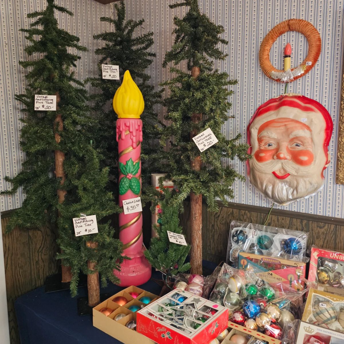 100% Vintage and Antique Christmas Collectibles from a nice, BIG lifetime collection. Included are: Old ornaments from USA, Poland, West Germany, Japan and more. Yards and yards of mercury glass garland. A Peco 6' Aluminum Tree and Evergleam Light Wheel, both in original boxes. Vintage Feather Trees - Many...including Sandy Elliott's and (3) Martha Stewarts in Original boxes with ornaments. Gurley Candles - Over 50! Blow Molds Old Sleds and a Toboggan too! Vintage Holiday Dish Sets and China Ruby Red Beverage Set, Avon Cape Cod Ruby Red Pieces Hundreds of Bagged Vintage Novelty Ornaments, Foil Garland, and collectible Christmas...