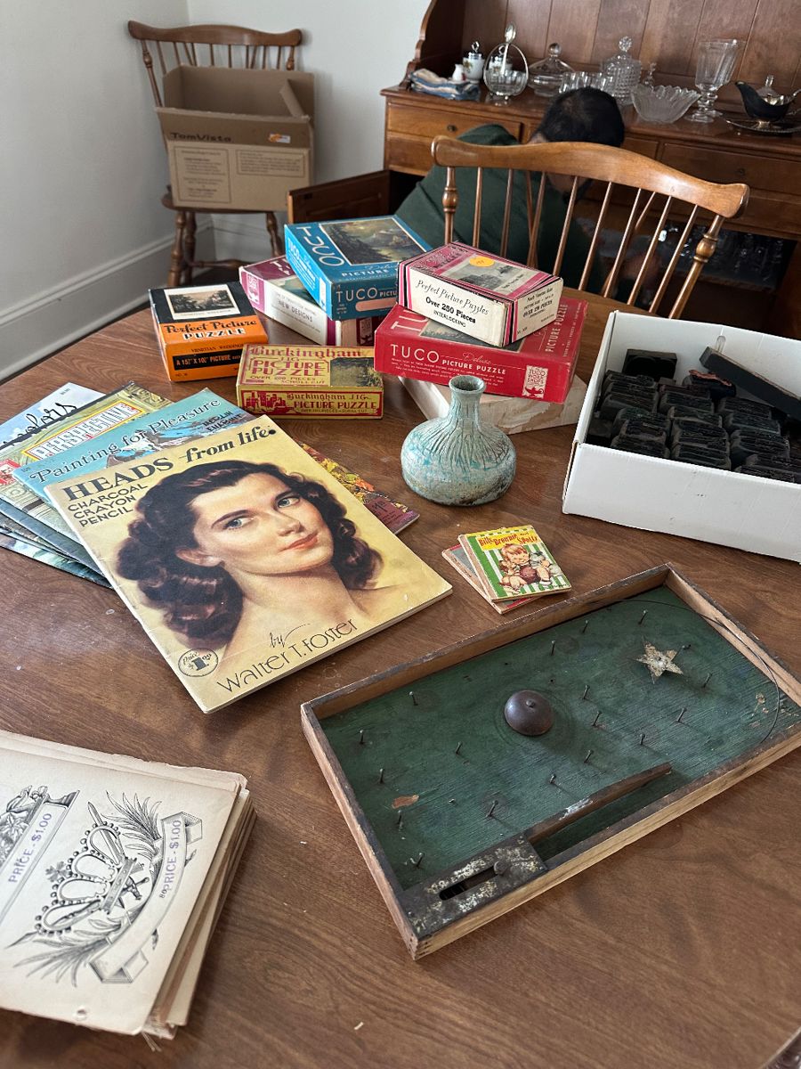 Solid wood furniture, beds and dresser sets, vintage holiday decor, tons of old Christmas bulbs, Avon nativity set, garage items, dishes and accessories, old printing press blocks, typewriter, old artists box, lots of old puzzles, Rattan chair, quilts, and crocks and jugs, embroidery and some fabulous antique paintings.