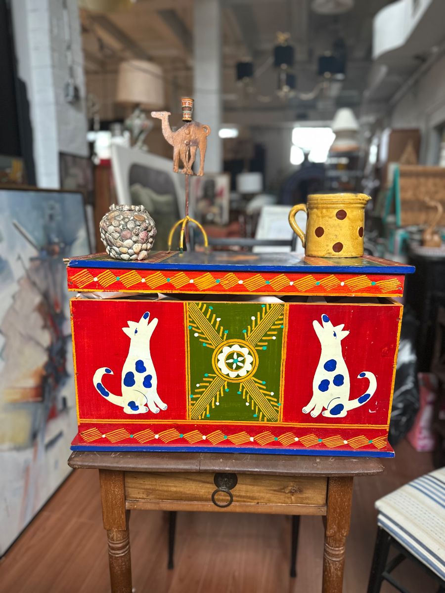 Just in - pottery, art glass, carnival glass, benches, ottomans, farm table, old pine, mixing bowls, fabric bolts, ceramic canisters, spice jars, danish chairs, antique folding standing desk, ball chair, indian clothing, books, numbers prints, tooled leather art, leather bags, Turkish rugs and runners, Hyde rugs!