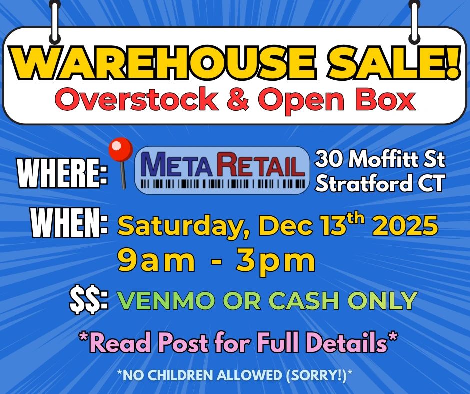 THIS SATURDAY (9 AM to 3 PM) -- Thousands of items overstock and open box items including gifts, toys, kitchen, home goods, and more! ** ADDRESS ** 30 Moffitt Street, Stratford, CT SOMETHING FOR EVERYONE Individual item deals “Fill a Box” deals (fixed price whatever you can fit) ALL KINDS OF STUFF Elf on the Shelf + Accessories, Ornaments, Stocking Stuffers, Whiskey Glasses, Candles, Closet Organizers, Toys, Flushable wipes, Whiskey Glasses, Baby Accessories (Teethers, Bottles, Swaddles) & more!!! Amazing deals on larger quantities or whole pallets! Don’t see what you want? Just ask… we may have it!