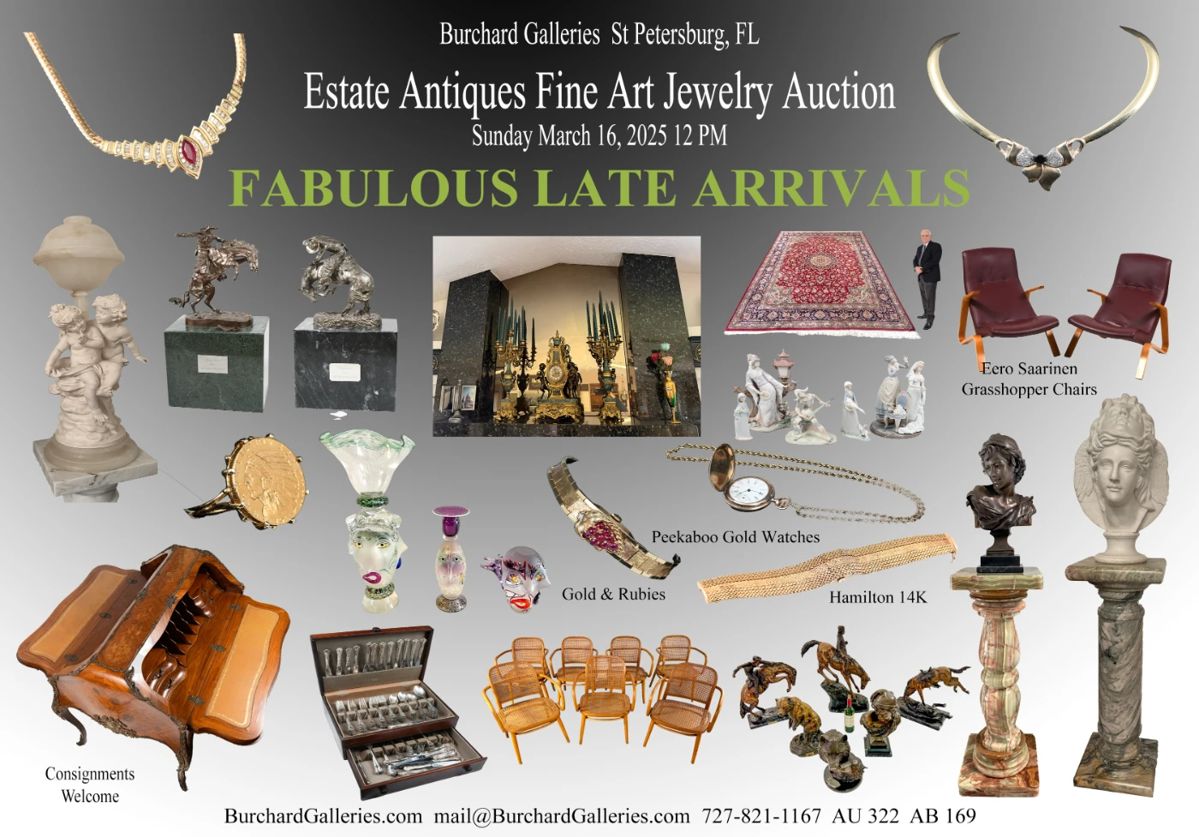 Burchard Galleries 2522 30th Avenue North St Petersburg Florida 727.821.1167 Presents Vintage Estate Antiques, Fine Art, High-End Modern & Jewelry Auction Sunday March 16, 2025 @ 12 Noon LIVE AUCTION, On-Line, Phone and Absentee Bidding Preview: 3/14 1-6 PM ● 3/15 11-4 PM ● 3/16 10 AM - all day Watch for upcoming Gallery Tour Videos Our March 16th Auction will feature Museum Quality Estate Antiques, Fine Art, Sculpture and Jewelry from Major Estate Collections. Featuring a High-End Modernists Estate from Miami FL. Also the Continuation of the Albert & Carmen Bambach Estate Collection of Silverplate from their Historic Mansion...