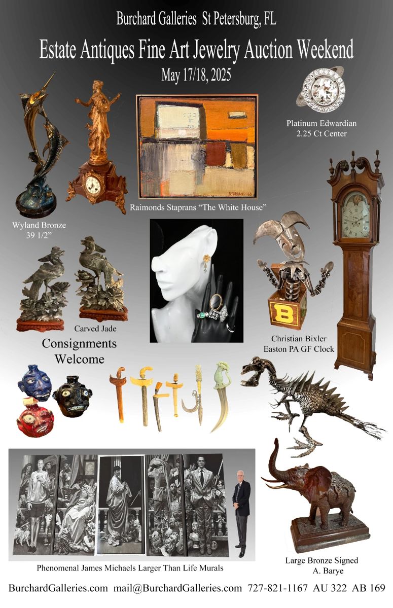 BIG AUCTION SUNDAY May 18, 12PM - ALL DAY Estate #Antiques, Much #Jewelry, Sculpture, Works of #Art. BurchardGalleries.com 727-821-1167 mail@BurchardGalleries.com CONSIGNMENTS WELCOME Our May 18th Premiere Estates Auction will feature Museum Quality Antiques, Fine Art, Sculpture and Jewelry from Major Estate Collections featuring New Mexican Artist Judith Hill; Items from Albert Carl (Pilot) and Joan Miller, Miss Northwest Airlines 1954; Steinway Baby Grand Piano;19th C Moonphase Grandfather Clock by Christian Bixler; Delphin Massier Style Flamingo Form Jardiniere; Dino Rosin Murano Art Glass; Carved Jade Birds; Antique Qing Dynasty Golden Elm Officers Chairs w Bat Carvings; Many, after Remington Large Bronzes;...