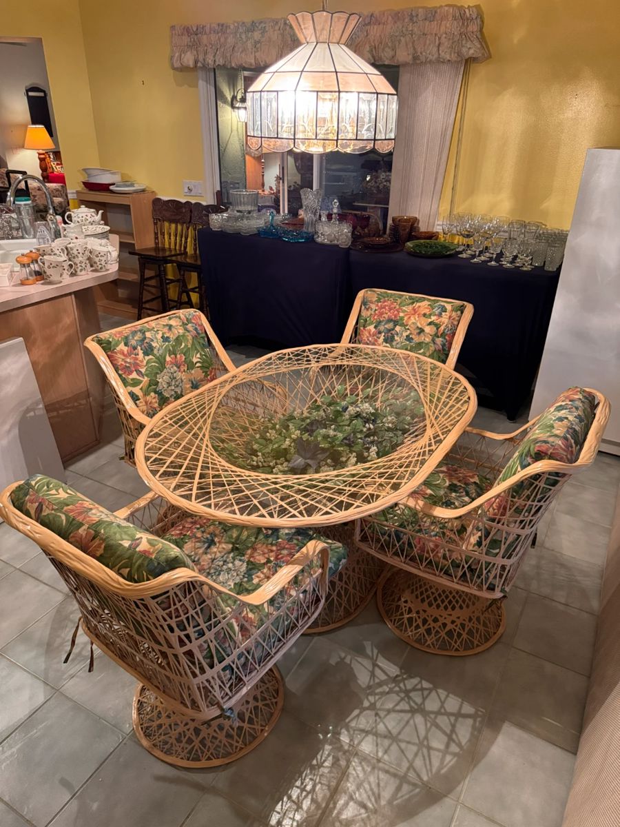 This home has a packed kitchen including: KitchenAid Mixer with attachments and Other Small Kitchen Appliances, Nice Rattan Upholstered Patio Sofa and Loveseat, Tile Top Sofa/Console Table, Vintage Lighted Buffet/Display Table, Blonde Wood Glass Top End Tables, Total Gym Pro Workout Bench, Tupperware Items, Handmade Dream Catcher, Holiday Decor, Artificial Flowers, Ceramic Hand Painted Cats, Vintage Oil Lamp, Matching Microfiber Manual Recliners, Floral Sleeper Sofa and Matching Side Chair with Ottoman, Sony Large Screen TV, Boston Surround Sound System, Doll High Chair/Rocker, Ethan Allen Queen Size Headboard and Footboard (no rails) and Matching Dresser with Mirror, Armoire and Night Stand,...