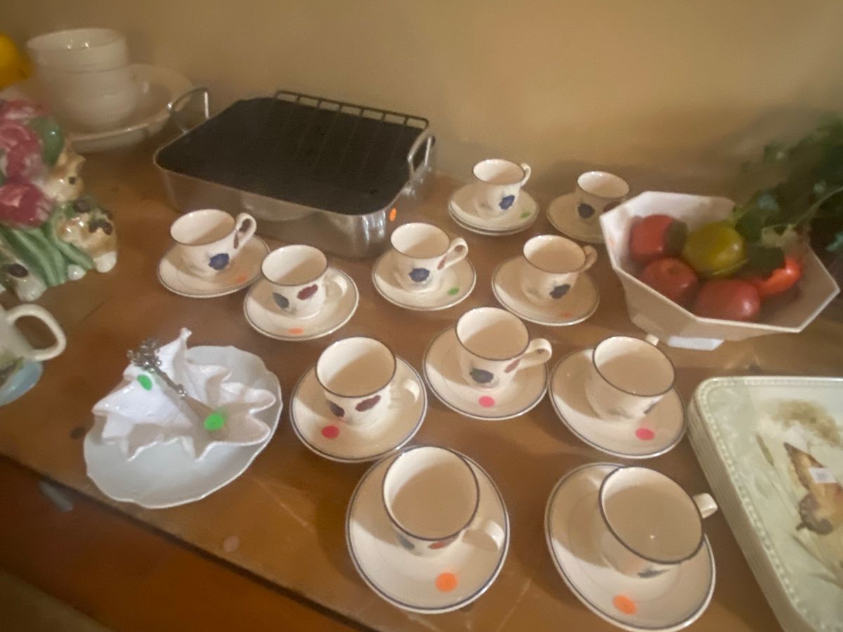 Dining table and chairs, hutch, King bed , Sofa and pair of Loveseats . Decor and kitchen , baskets