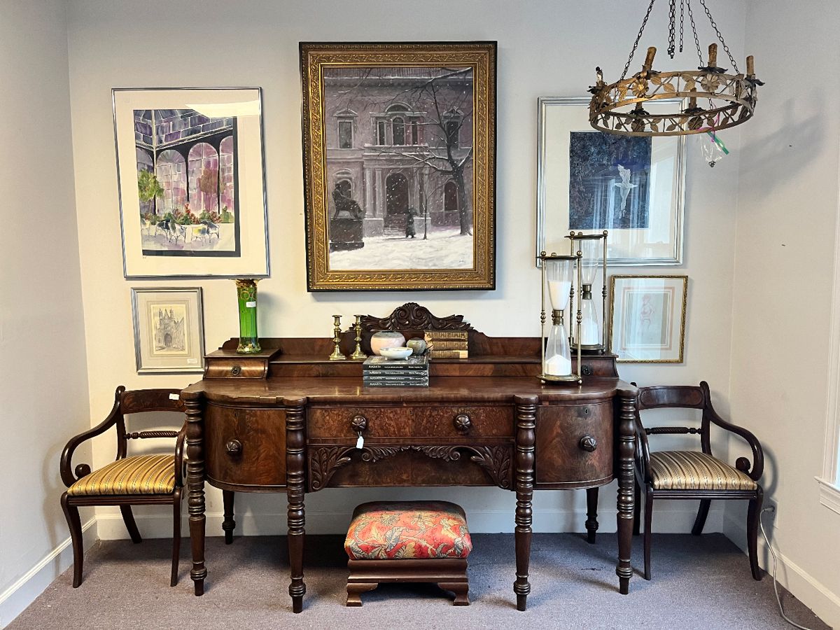 The estate building is full again. The new merchandise will follow our regular pattern of discounting, but the items that are from earlier consignments will be priced to go. We have brought in hundreds of pieces of local art, a large collection of Shelley English Bone China, lots of smalls and antique furniture including: Bea Kulkhe water colors Jim Lyle ware colors and oils of all sizes Randy Lambeth water colors, including local scenes Karen Banker water colors Jim Carson acrylics and oils Spectacular Regency English C. 1820 carved sideboard Set of 10 Adams Regency chairs English C 1800s campaign...