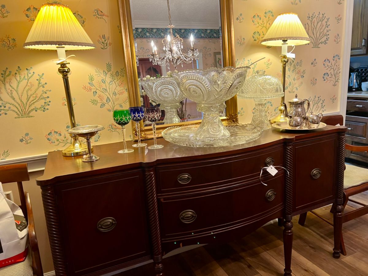 This is a great sale mixed with lots of things. Antiques, Queen riced carved bed, sterling pieces, sterling set of flatware, tons of gold jewelry and costume jewelry, coins, large Louis Vuitton wallet, Asian trunk, Antique China cabinet, Antique buffets, Kentucky derby glasses, barware, China, Crystal, chippendale sofa, records, lots of kitchen stuff, sewing machine, tools, riding lawnmower, trailer, clothing, shoes, name brand purses, baby bassinet, art work, several John Bayides pieces of art, Hoosier cabinet, pottery, and much more. Adding pictures. Keep checking back. NOT RESPONSIBLE FOR ACCIDENTS, CHILDREN MUST BE WITH PARENT AT ALL TIMES. CASH OR LOCAL...