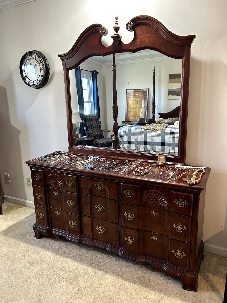 Welcome to Jones Creek! This 2 story home in a quiet cul-de-sac is full and ready to go! * Sofa and matching apartment sofa (excellent condition) * End tables/side tables and foyer tables * Entertainment center (may also be used as armoire) * Beautiful burl secretary * Glass figurines * Fine china * Sterling silver and silver plated * Crystal * Dining room table with leaf and 6 chairs (excellent condition) * Vintage Church pew * CHAIRS! Lots of chairs - all shapes and sizes * Beautiful King Rice bed with step stool * Dressers with mirrors * Chest's *...