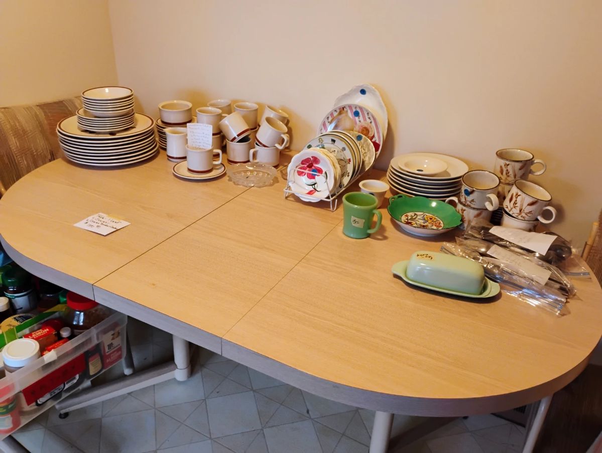 USE THE DOOR ON THE EAST SIDE OF THE HOUSE - ENTER THE SECOND DOOR. This family immigrated from Austria and built this Morton Grove home in the 1950's. Many European and MCM items! KITCHEN: Table & 4 chairs, 1 leaf ( 2 chairs needs new casters) variety of cookware / Corning WARE / glassware/ utensils / dishes DINING & LIVING ROOMS: Dining table ( 2 built in leaves) and 6 chairs (spring seats) from Germany / various sets of China / serving platters / crystal / serving pieces / flatware / vases / White couch & matching Queen Ann...