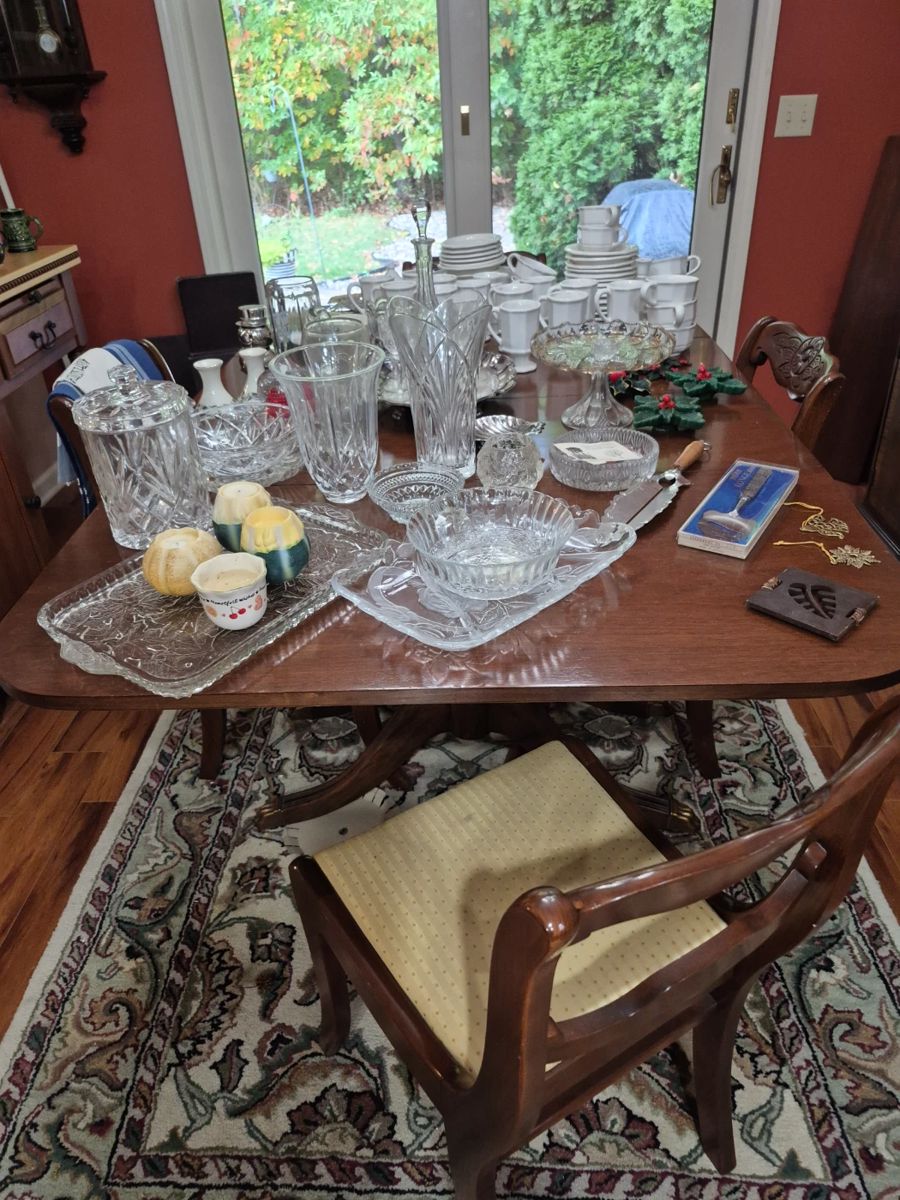 THIS IS A LOVELY SALE FILLED WITH A WIDE ASSORTMENT OF ITEMS. FULL SET OF LENOX CHINA LOVELY DINING TABLE WITH 4 CHAIRS AND LEAVES AND PADS INCLUDED HUGE SNOWMAN COLLECTION DINING BUFFET SOFA TABLE ENTERTAINMENT CENTER LOVESEAT MATCHING OCCASIONAL CHAIRS HUGE COLLECTION OF COOKBOOKS LONGABERGER BASKET COLLECTION LOVELY ARTWORK LOTS OF CHRISTMAS ITEMS CRYSTAL FLATWARE RIDGEWAY GRANDFATHER CLOCK LOTS OF SHOES AND CLOTHES LINENS RECORD COLLECTION. FULL KITCHEN. HOUSE IS CLEAN AND FULL. HOPE TO SEE YOU THERE!