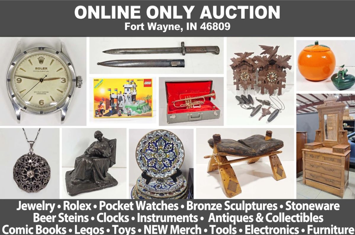 ONLINE ONLY AUCTION *** WE CAN SHIP MOST LOTS *** Fine Gold & Silver Jewelry, Costume Jewelry, Hummels, Reproduction Frederick Remington Bronze Statues, Antiques & Collectibles, Antique Furniture, Comic Books, NEW Merchandise, Vintage Toys, Legos, Clocks, Music Instruments, Military Items, Vintage Toy Soldiers, Stoneware, China Sets, Beer Steins, Vintage Glassware, Religious Decor, Games & Puzzles, Electronics, Wall Art & Decor, Books, Banks, Kitchenwares, Housewares, Clothing, Tools, Gardening Supplies, Automotive Items & Much More! Auction Begins: Tuesday, November 11th @ 7:30 PM EST Auction Ends: Tuesday, November 18th with first lot closing @ 7:30 p.m. EST WE CAN SELL YOUR COLLECTIBLES...