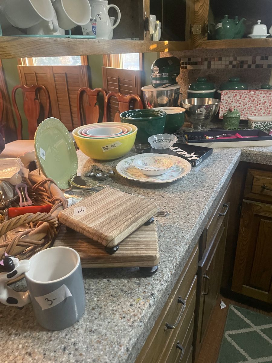 BEAUTIFUL SALE!! DINING TABLE WITH CHAIRS AND MATCHING HUTCH LAZY BOY RECLINER SOFA WITH MATCHING CHAIR HALL TREE 2 STRESSLESS CONSUL LEATHER CHAIRS WITH OTTOMAN WASH STAND DRESSER AND MATCHING NIGHT STAND OAK SECRETARY OAK DRESSER IRON FULL BED I COMFORT TWIN MATTRESS BOOKCASES PIE SAFE MIKASA SILVER MOON CHINA INTERNATIONAL FLORENTINE FOLKCRAFT PINECONE POLISH POTTERY DISHES SIAM THAILAND BRASS AND ROSEWOOD ROGERS BROS. IS "FIRST LOVE" 4PC VINTAGE PYREX NESTING BOWLS IN NEW CONDITION! PLAYBOY BAR SET JADEITE BOWL AND MIXING BOWL KITCHEN AIDE MIXER FRENCH WHITE CORRELL PAMPERED CHEF APPLE PEELER BLENDER COFFEE MAKER CAPRI RUFFLED BERRY BOWL...
