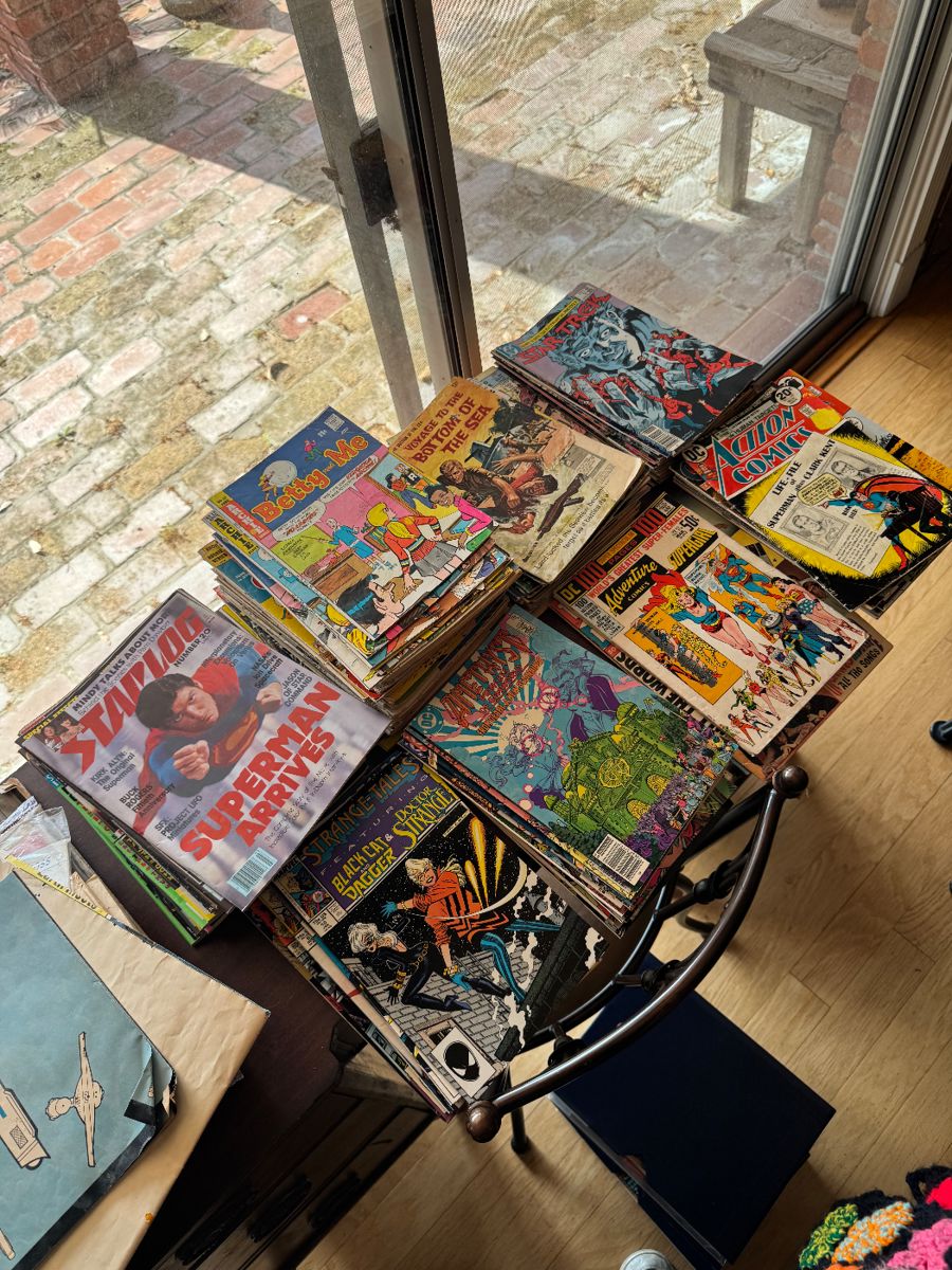 Tons of vintage comics, antique furniture, Corning wear, vintage games and puzzles, records, typewriters, vintage glassware and bar ware. Fancy Maharam upholstery fabric, SO MANY VINTAGE BOOKS- sci pulps, military fiction, religious, and much much more.