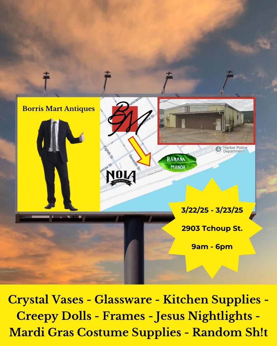 IYKYK – Everything Must Go! @borrismart504 on instagram. Saturday, March 22 & Sunday, March 23 9 AM – 6 PM 2903 Tchoupitoulas St., New Orleans, LA Store is being demolished – EVERYTHING MUST GO! Bring your friends and shop incredible vintage finds before it’s too late! Featured Items: • Framed Artwork & Prints • Crystal Drinkware & Glassware • Red-Stemmed Wine Glasses • Antique Tin Tea Canisters • Silverware & Cutlery • Loose & Framed Prints • Crystal & Glass Décor • Vintage Picture Frames • Decorative Brass & Gold Items • Collectible Figurines • Unique Home Accents Cash &...
