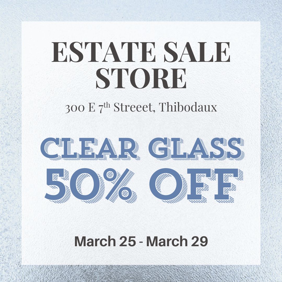 BIG SALE on our clear glass this week! 50% OFF clear glass at our Estate Sale Store this week, Wednesday 3/26 - Saturday 3/29.