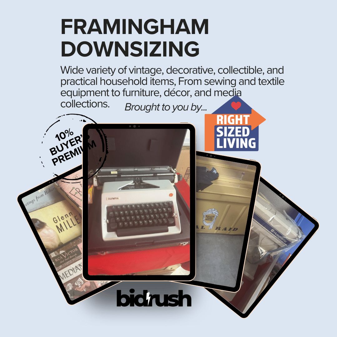This Framingham downsizing sale offers a wide variety of vintage, decorative, collectible, and practical household items. From sewing and textile equipment to furniture, décor, and media collections, this catalog includes something for every type of bidder. All items start at $1 with no reserves and easy local pickup on Saturday Dec 6th 9 - 12 pm at 15 Pleasant St Connector, Framingham, MA, 01701 Featured Categories Vintage Sewing, Craft & Textiles Husqvarna sewing machine & accessories, Large assortment of vintage sewing patterns (McCall’s, Vogue, Simplicity, Butterick), Knitting and yarn supplies, Textile & craft books, Weaving loom and notions, Ceramics, Pottery...