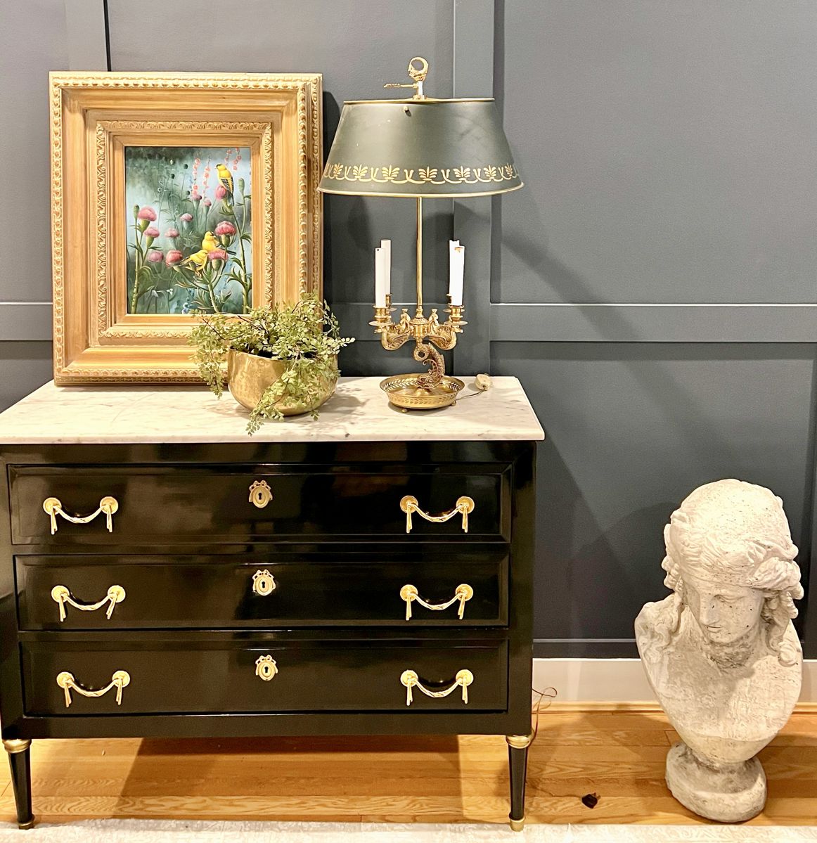 This private by-appointment sale features a curated selection of designer furniture, fine art, and high-end décor from a luxury Chevy Chase residence. All items are available for immediate purchase and pickup this weekend only . Expect to find: Ebonized Black Chest of Drawers (attributed to Maison Jansen) – elegant Hollywood Regency style with brass detailing., Large 19th-Century Oil on Canvas – richly colored, gilt-framed painting with period character., Restoration Hardware Sofa – luxurious black velvet with brass frame, excellent condition, modern silhouette., Jonathan Adler Bar Table – chic accent piece with polished brass base and lacquered top., Mitchell Gold shagreen...