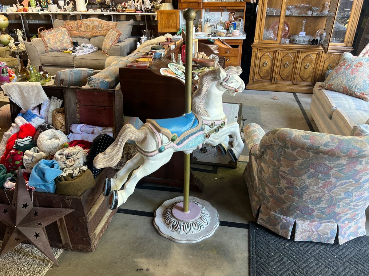 Welcome to the MT Barn Sale! We have a fabulous collection of items that have been moved from a Gull Lake Estate, as well as items from “Grandmas” storage unit. We have stunning hand painted furniture, floral sectional, Fenton glass, Coca Cola Collection, vintage carousel horse, primitives, pinball machines, jukebox, antiques, holiday, and so much Moore.