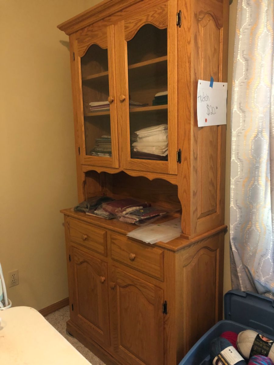 Vintage Pyrex Hit Air Ballon chip and dip bowl Elna Quilter’s Dream Sewing machine Koala folding sewing tables - 2 Fabric - large selection for quilting Ironing board and Rowena steam iron Hutch and dresser Sewing notions, yarn and crafts Stereo system and albums Art work - lots Books and movies Round occasional tables Mission style end tables Dining room table and 6 chairs China Hutch and Buffet Oak table and 4 chairs Barristers book shelf Numerous book shelves Blueair Air Purifiers Portable filing cabinets Dishes and silverware Knick knacks, nativity sets and Noah’s Ark figurines Office supplies Bedroom furniture...