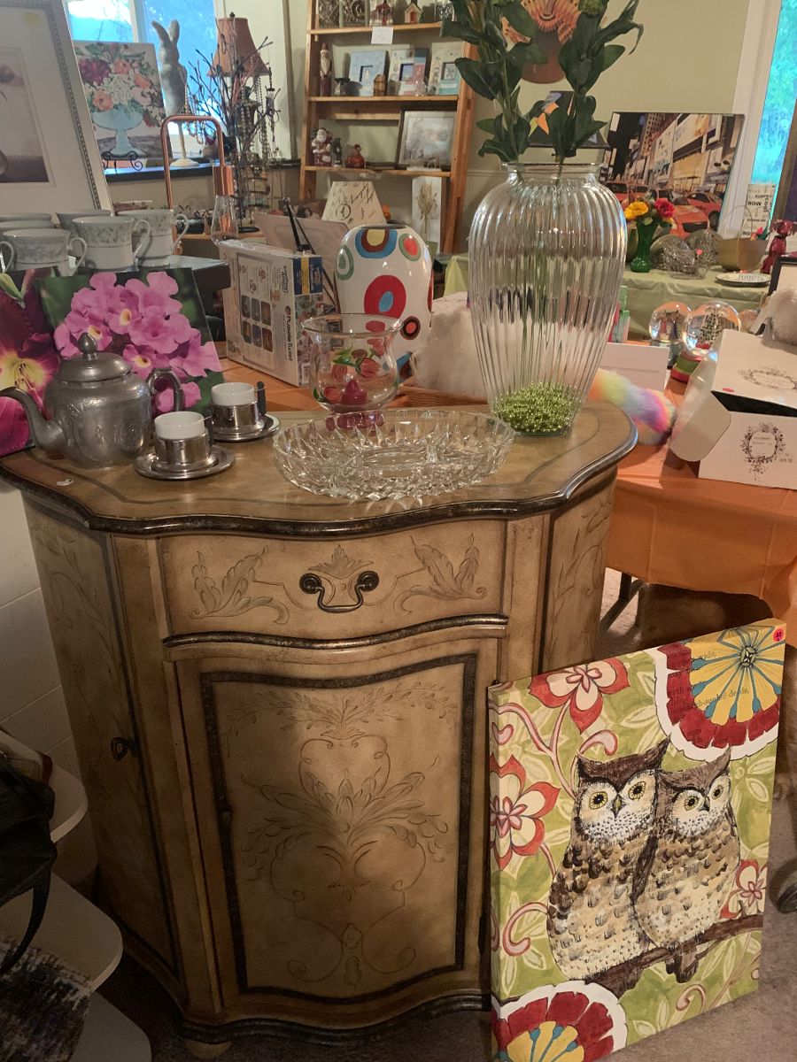 Small furniture, Artwork, Holiday Decor, old cameras, old stereo, home decor, dishes, costumes, books, DVDs, toys, puzzles, and garden