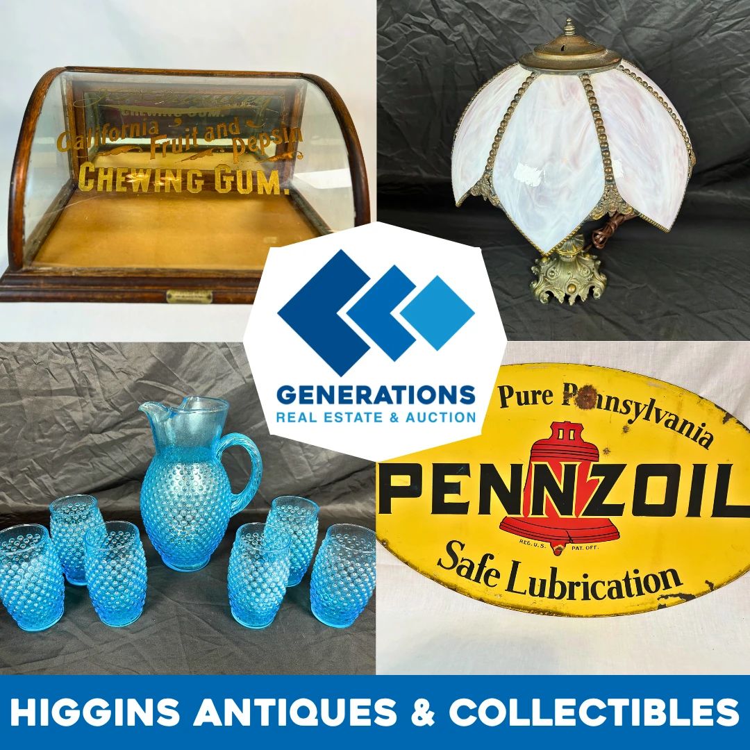 The Higgins Estate of Antiques & Collectibles - Carthage, MO Step into a treasure trove of timeless charm and collectible beauty in this expansive auction, where every piece tells a story. From classic home accents to nostalgic keepsakes, you’ll find something special to delight every collector and decorator alike. Glassware, Ceramic, Porcelain, Fenton, Hobnail, Westmoreland, Early American Pieces, Blue Willow, Ironstone, EAPG, Lead Crystal, Pottery, McCoy, Stoneware, Copper, Collector Glasses, Men-Women Clothing & Hats, Lighting, Clocks, Mirrors, Rugs, Furniture, TVs, Small Appliances, Vintage Cameras, Collector Plates, Antique Lanterns, Quilts & Linens, Raikes Bears, Lowell Davis Figurines, John Deere Models &...