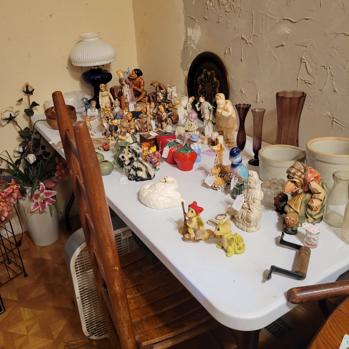 Antiques hoarder. Glassware, furniture, jewelry and figurines.