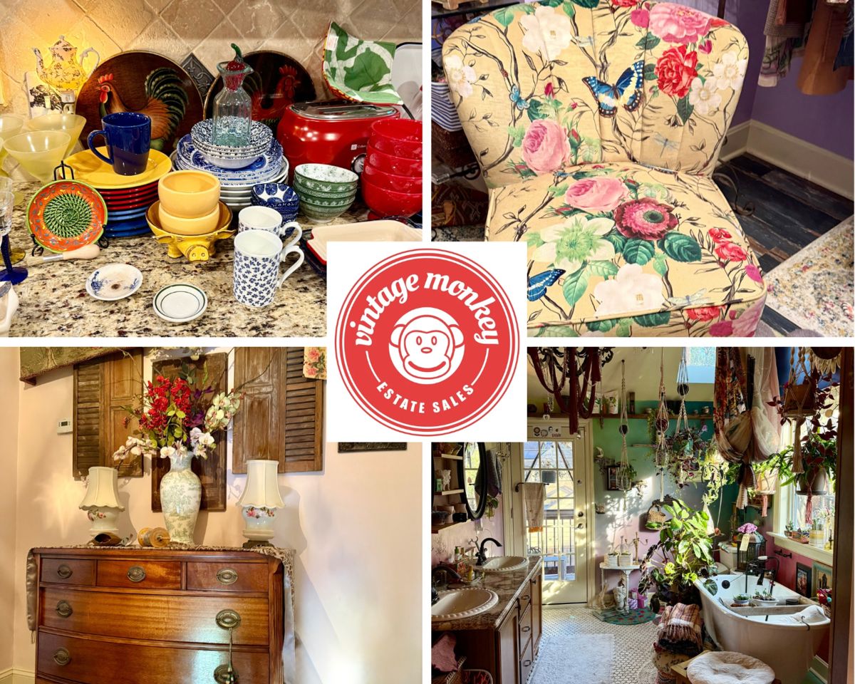 Follow us on instagram: @VintageMonkeySales FURNITURE Floral sectional, Red loveseat, Vintage Duncan Phyfe drop side dining table, 4 vintage dining chairs, carved front black cabinet, several side tables, Duncan Phyfe style buffet, 2 leather like small benches, full navy blue upholstered bed, full mattress, very small drop side desk, vintage oak dresser with swivel mirror, king mattress & boxspring, Duncan Phyfe style tall dresser x2, Duncan Phyfe low dresser, Duncan Phyfe, Duncan Phyfe style desk, Duncan Phyfe style side table- natural wood & painted with decals x2, Asian style tv cabinet, Decorative floral chair, French style upholstered chair, 2 matching...
