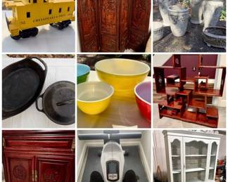 Gorgeous Oriental Hand-Carved Furniture, Pyrex, Lionel Train Set, Small Hutch, Tons of Cast Iron and