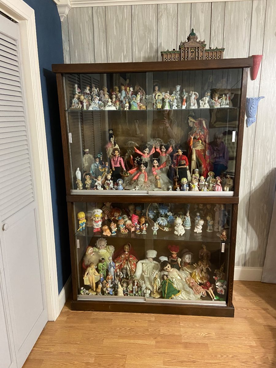 This sale consists of antique furniture, depression glass, George & Martha lamps, baskets, linens, kitchenware, outdoor furniture, extensive bottle and jar collection, doll/figurine collection, and a variety of other collectibles.