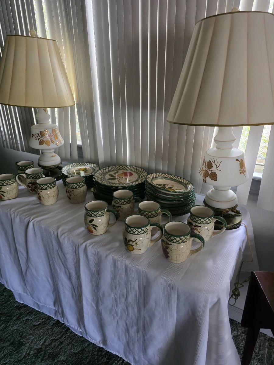 Neat patio wooden furniture, great kitchen items, pyrex, corning, extremely unusual lamps--- great ladies hats with boxes, beautiful sofa,